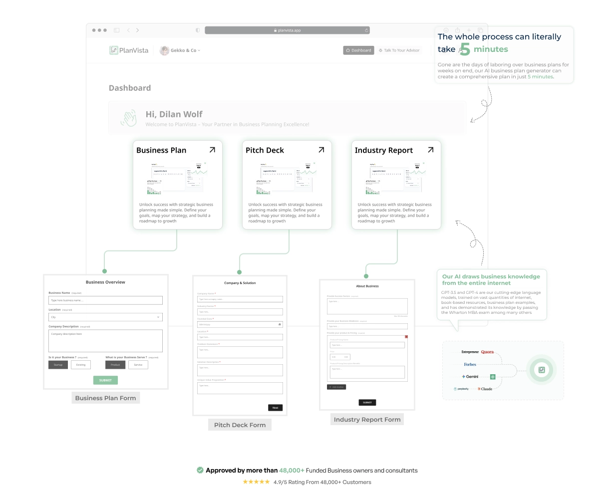 At Planvista.app, your privacy comes first. We only collect essential data to create your business plan and improve our service. Your information is secure and never shared without your consent. Learn more about our Privacy Policy.